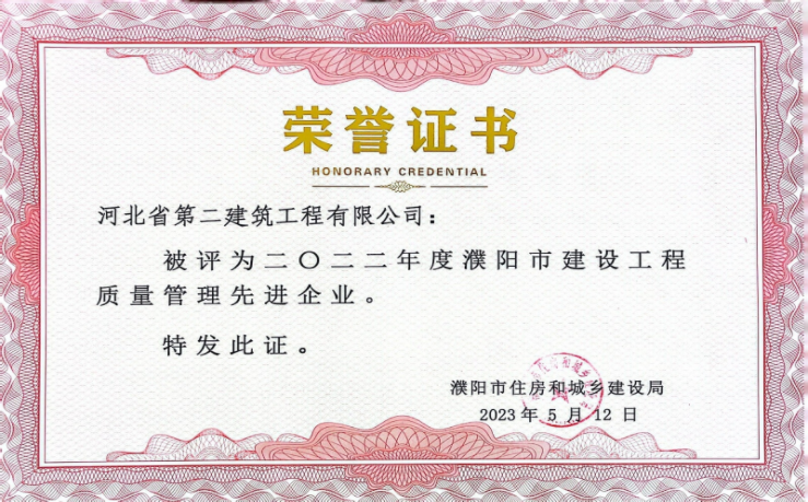公司榮獲濮陽(yáng)市“2022年度建設工程質(zhì)量管理先進(jìn)企業(yè)”榮譽(yù)稱(chēng)號