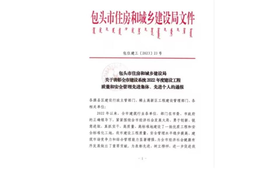 九分公司內蒙古農業(yè)大學(xué)項目榮獲包頭市“2022年度建設工程質(zhì)量和安全管理先進(jìn)集體”榮譽(yù)稱(chēng)號