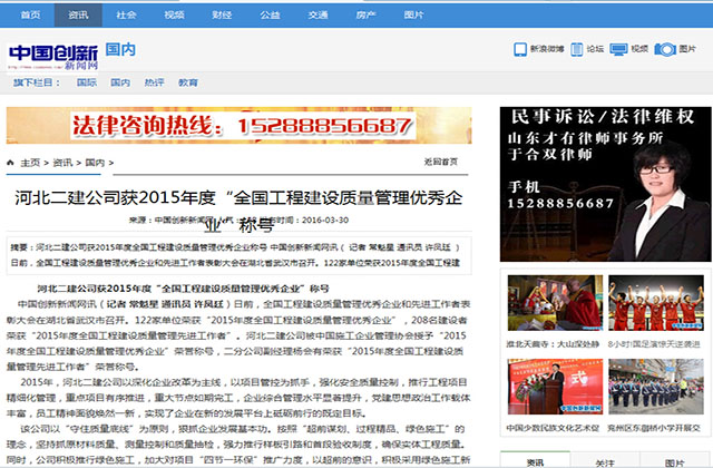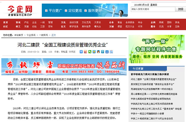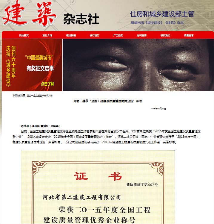 2016年3月16—18日,全國工程建設質(zhì)量管理優(yōu)秀企業(yè)和先進(jìn)工作者表彰大會(huì )在湖北省武漢市召開(kāi)。公司被中國施工企業(yè)管理協(xié)會(huì )授予“2015年度全國工程建設質(zhì)量管理優(yōu)秀企業(yè)”榮譽(yù)稱(chēng)號,二分公司副經(jīng)理楊會(huì )有榮獲“2015年度全國工程建設質(zhì)量管理先進(jìn)工作者”榮譽(yù)稱(chēng)號。
