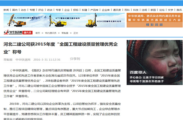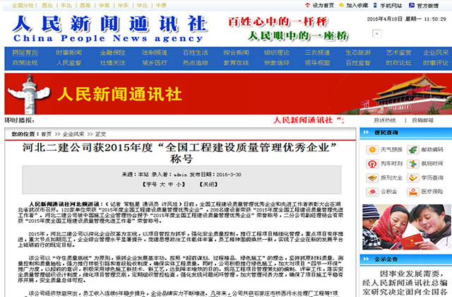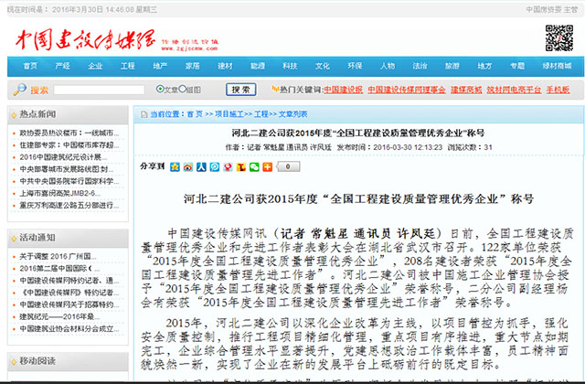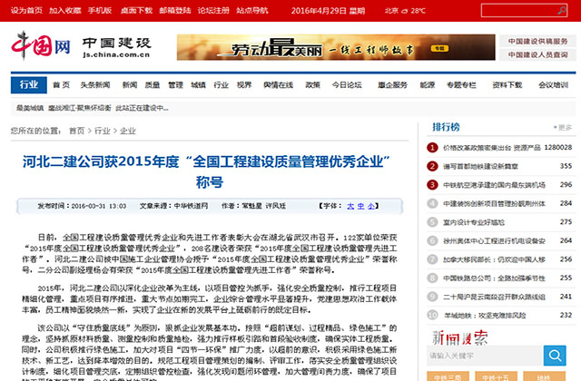 隨后,中華人民共和國住房城鄉建設部主管的《建筑》雜志社及中國新聞通訊社、中國網(wǎng)、中國建設傳媒網(wǎng)、央廣網(wǎng)、新絲路資訊網(wǎng)、人民鐵道網(wǎng)、中華鐵道網(wǎng)、中國創(chuàng )新新聞網(wǎng)、中國路面機械網(wǎng)、揚州熱線(xiàn)、中國起重機世界網(wǎng)、天之水網(wǎng)、娛樂(lè )網(wǎng)、今企網(wǎng)、河北省國資委、河北建工集團、重慶重商、中鐵七局官網(wǎng)等20余家媒體對公司獲獎進(jìn)行報道,總瀏覽數超10000人次。