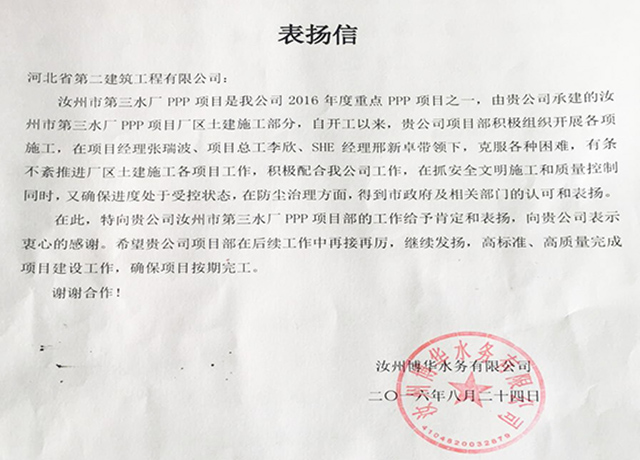 六分公司 河南汝州水廠(chǎng)項目受到甲方表?yè)P 來(lái)源: 修改時(shí)間:2016.09.14 瀏覽:4957 六分公司河南汝州水廠(chǎng)項目受到甲方表?yè)P 近日,業(yè)主將一封表?yè)P信送到六分公司汝州第三水廠(chǎng)PPP項目部,該項目全體職工倍受鼓舞。該工程位于河南省汝州市,水廠(chǎng)廠(chǎng)區建設規模6萬(wàn)噸/d,工期240日歷天。項目人員經(jīng)過(guò)兩個(gè)半月的努力,已完成工程總任務(wù)量的42%,該工程最大清水池于近期封頂,吸水井已完工,泵房達到±0,其他房號底板已完成。(曹艷玲) 上一條 返回列表 下一條