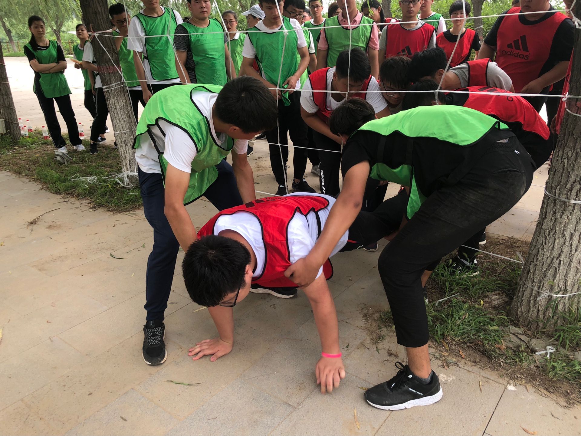 《真人CS》項目中,在教官的講解下,兩隊隊員分別著(zhù)各自隊服,手持彩彈模擬槍?zhuān)环焦?,一方守。大家身臨其境地感受到“槍林彈雨”的作戰場(chǎng)面,在叢林間上演了一場(chǎng)場(chǎng)激戰。在戰斗過(guò)程中,各隊發(fā)揮團隊作戰的優(yōu)勢,進(jìn)行了智慧、力量和勇敢的較量,夾擊、包抄、迂回等各種戰術(shù)均有所體現,面對敵方的火力壓制,隊員們仍堅守陣地,用自己的“生命”換取全隊的勝利?!端细偧肌讽椖啃枰逝览K索、踩踏板過(guò)河、走油桶。著(zhù)力培養大家挑戰自我的勇氣和膽識。各隊隊長(cháng)根據隊員各自所長(cháng),合理分工、隊員之間互相鼓勵、合作互補,終于接力完成了這個(gè)項目?!肚伤篈4紙》項目需要將一張小小的A4紙撕成一個(gè)大圓圈,在不能破損的情況下,讓全隊隊員都站進(jìn)圓圈內。這個(gè)項目著(zhù)力訓練了大家的創(chuàng )新力和凝聚力,教會(huì )了大家圍繞既定目標開(kāi)拓思路、集思廣益,還激發(fā)了大家的創(chuàng )新意識?!洞┰诫娋W(wǎng)》項目需要在規定的時(shí)間內,每一位隊員都翻越由不同面積空擋組成的“電網(wǎng)”。項目開(kāi)始后,大家一起研究,根據每個(gè)人的體形制定通過(guò)方案,每個(gè)人通過(guò)時(shí),提衣服的、壓腿的、繃腳的,指揮的都是有條不紊地進(jìn)行,直到最后一名隊員通過(guò),全場(chǎng)響起熱烈的掌聲,大家為團隊的精誠合作歡呼不已。紛紛表示,信任同伴、相信集體是融入團隊、開(kāi)展工作的基礎。