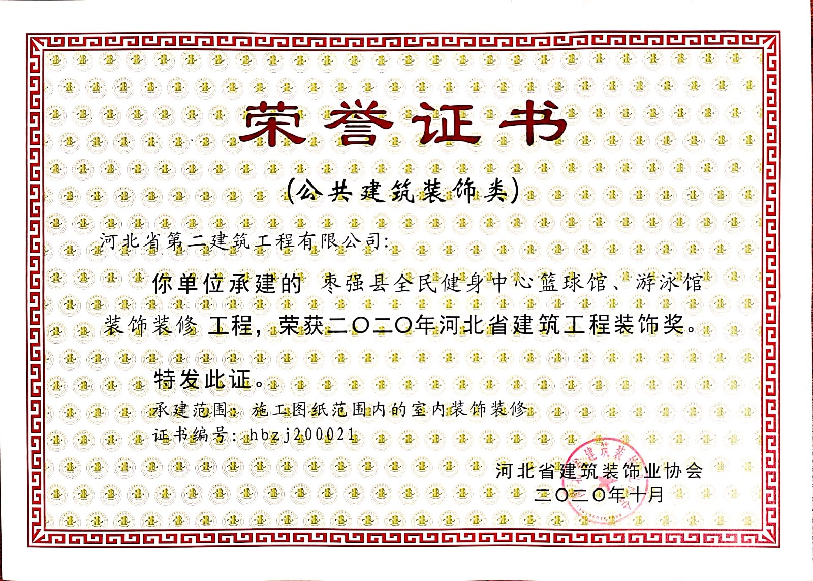近日,從河北省建筑裝飾業(yè)協(xié)會(huì )獲悉,由四分公司承建的棗強縣全民健身中心籃球館、游泳館裝飾裝修工程喜獲2020年度河北省建筑工程裝飾獎(公共建筑裝飾類(lèi))。