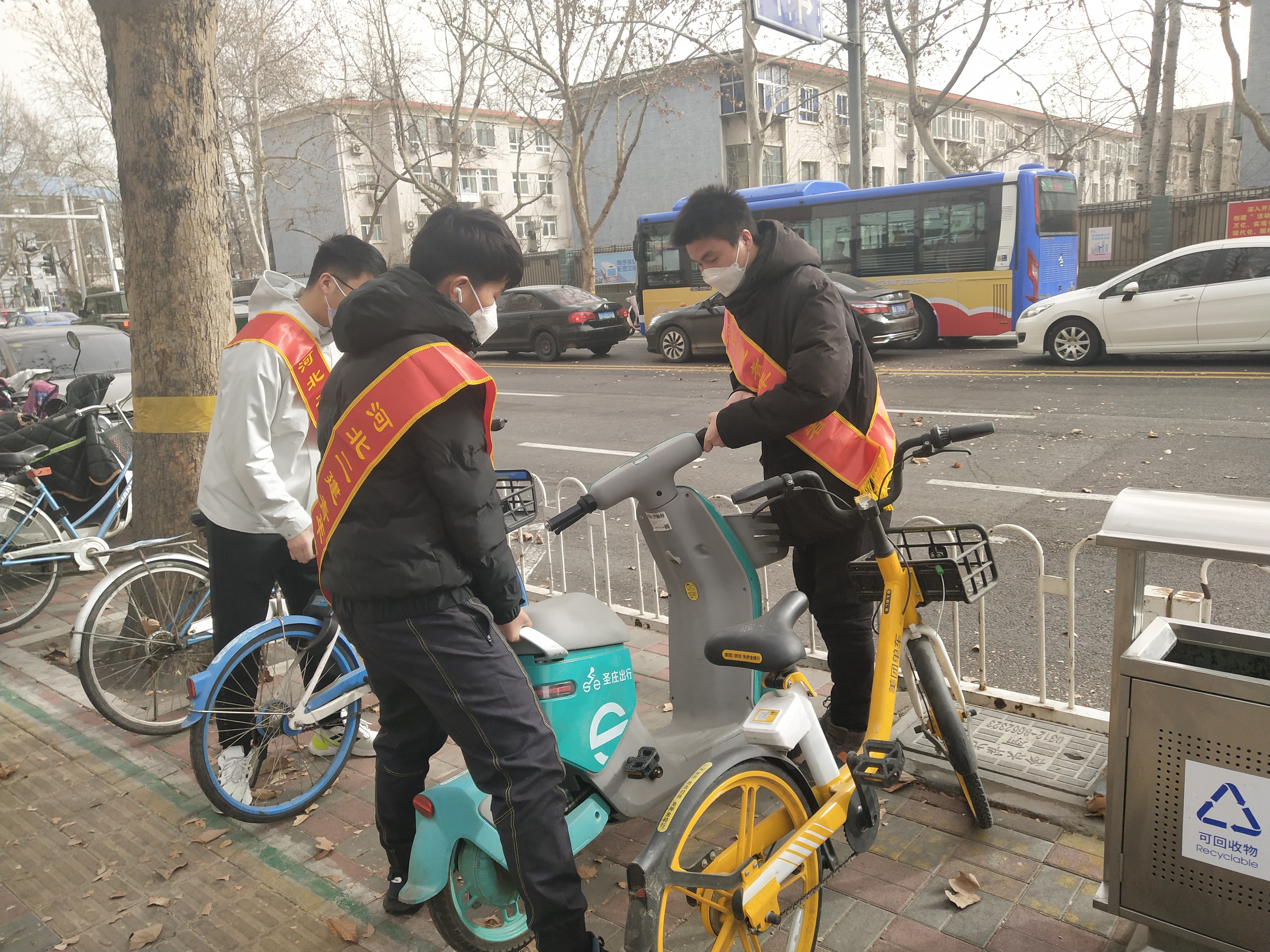 志愿者們來(lái)到友誼大街,沿路扶起“摔倒”在公交站的單車(chē),將道路兩旁隨意停放的共享單車(chē)推到指定停放點(diǎn)擺放整齊,并將車(chē)籃里的垃圾清理干凈。體重較大的共享電動(dòng)車(chē)一個(gè)人搬起來(lái)有些費力,大家便兩人一組,齊心協(xié)力將其“搬回家”,青年志愿者們用行動(dòng)詮釋著(zhù)“奉獻、友愛(ài)、互助、進(jìn)步”的志愿服務(wù)精神。