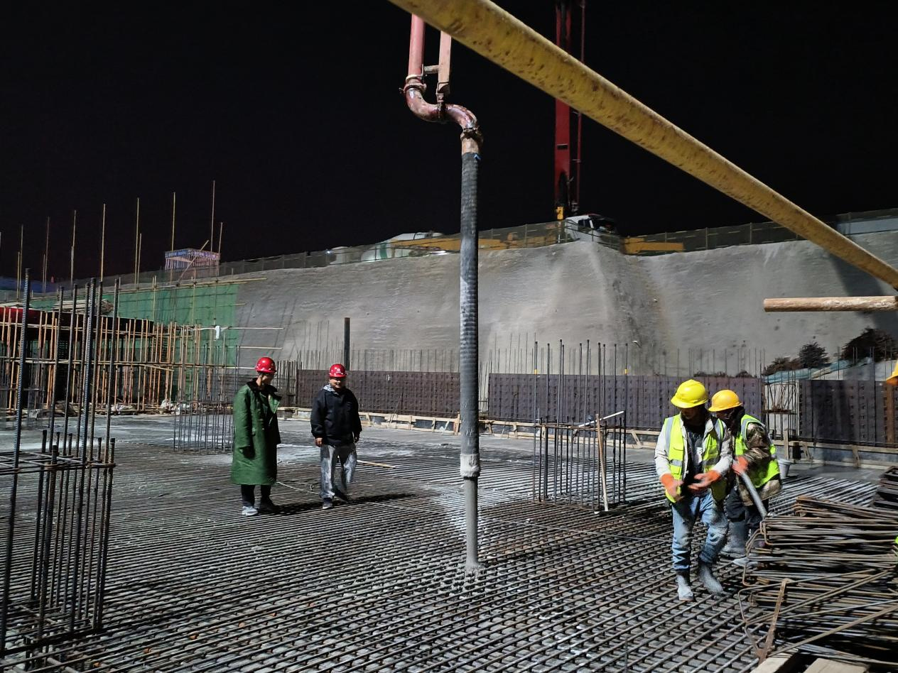 筏板基礎澆筑前,項目副經(jīng)理任榮的孩子剛出生第二天,使命感和責任感促使他放下嗷嗷待哺的孩子和身在“月子中”的妻子匆匆趕回項目部。到達項目部的第一件事就是對各作業(yè)隊下發(fā)階段任務(wù)指標,增加人員和機械設備,實(shí)行晝夜倒班生產(chǎn)制度。為讓項目管理人員更快掌握澆筑方法和技術(shù)要求,技術(shù)人員何昭冶提前編寫(xiě)大體積混凝土施工方案和技術(shù)交底,組織學(xué)習了混凝土澆筑工藝和養護方式,確保施工順利進(jìn)行。
