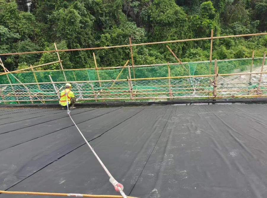 為保證雨季斜屋面施工安全,創(chuàng )造安全生產(chǎn)工作環(huán)境,項目部召開(kāi)了專(zhuān)題會(huì )議研究制定專(zhuān)項施工方案,并采取四項有效措施確保安全施工。一是在屋脊上增設通長(cháng)鋼絲繩用于施工人員系掛安全帶,為防止鋼絲繩過(guò)長(cháng)彈性變大,兩端集中受力,每4m設置彎鉤式膨脹螺栓用于分隔固定。二是因考慮到普通五點(diǎn)式安全帶的安全繩長(cháng)度不能滿(mǎn)足施工需求,項目部增加了配套的加長(cháng)安全繩,用于連接鋼絲繩與安全帶。三是在外架內側斜屋面屋檐四周按要求設置高度為1.5m的通長(cháng)防護欄桿,并采用安全平網(wǎng)全封閉。四是重點(diǎn)對斜屋面施工作業(yè)人員進(jìn)行專(zhuān)題培訓和安全教育,增強其安全意識,杜絕違章操作。