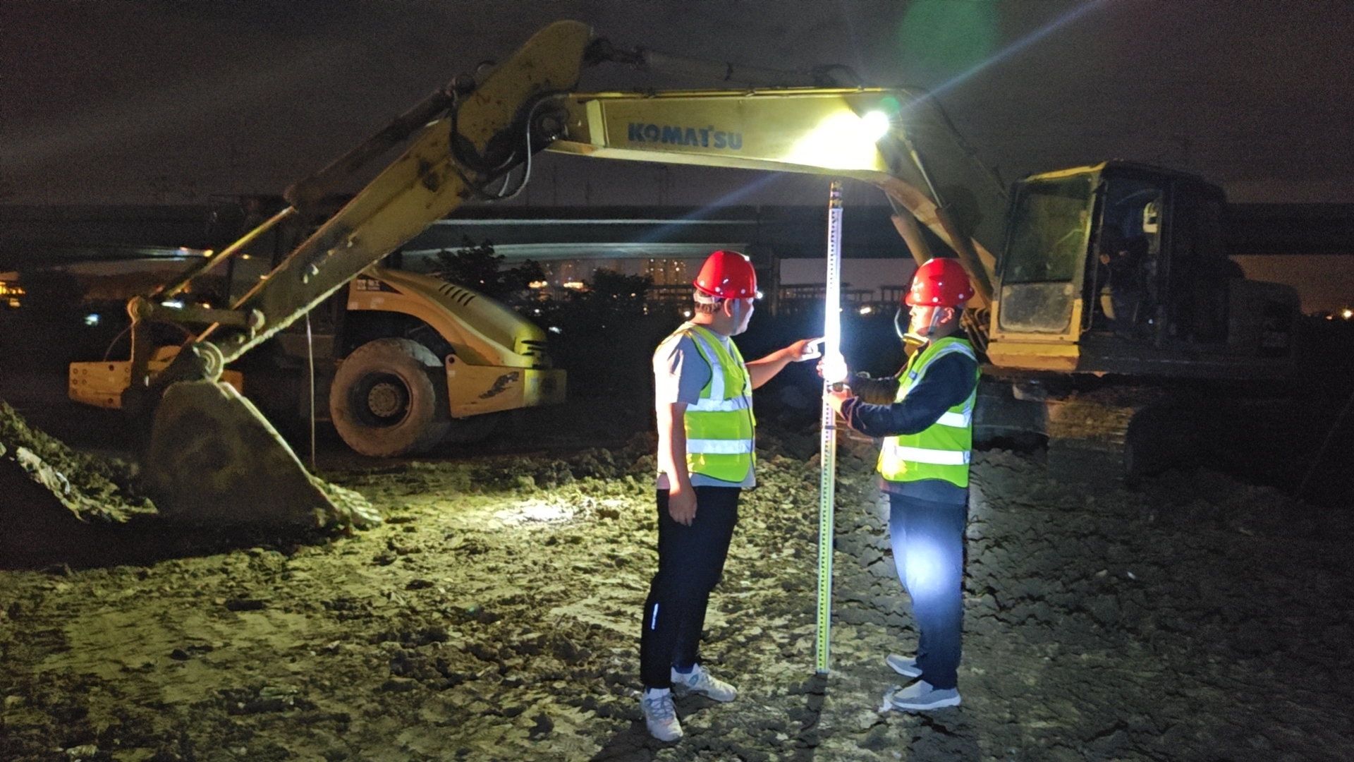 “千磨萬(wàn)擊還堅勁,任爾東南西北風(fēng)”。項目部在完成原始地貌高程測繪后,項目黨員李鵬沖帶領(lǐng)入黨積極分子張佳浩和陳迎虎立即對影響施工的障礙物進(jìn)行標識,采用方格網(wǎng)法對施工區域的土石方量進(jìn)行測量。福州地區正處雨季,最近一周每天都有大雨或中雨,但前期測量工作進(jìn)度不能耽誤分秒,他們合理分工,“流水”作業(yè),有的負責砍樹(shù)除草做好清表工作,有的負責找好點(diǎn)位架上測量?jì)x器,有的負責拉緊隊友腰間的安全繩做好防滑措施。遇見(jiàn)地質(zhì)條件稍好點(diǎn)的地段,三人便分成兩班,至少兩個(gè)人配合測量數據,留一個(gè)人輪流休息和用餐。他們?yōu)榱私o隊友創(chuàng )造更多的休息時(shí)間,換班時(shí)間一推再推?!爱斷?,當啷……”臨建施工現場(chǎng)挖機的聲音不絕于耳,夜晚整個(gè)施工現場(chǎng)燈火通明、機械運轉、施工正酣,映襯出一片光與影的交錯。經(jīng)過(guò)120多個(gè)小時(shí)的晝夜奮戰,完成了3024個(gè)點(diǎn)位420組數據的測量和復核。6月4日臨建土方回填及墊層混凝土澆筑如期完成。即使是這樣,大家仍然不敢有絲毫松懈,他們都知道這只是第一個(gè)小節點(diǎn)的完成,隨之迎來(lái)的才是真正的挑戰。