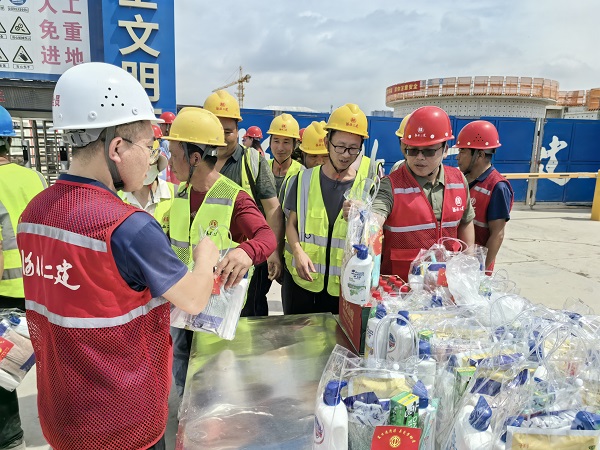 活動(dòng)當天,項目經(jīng)理王世佳手持滿(mǎn)載心意的“防暑大禮包”,深入施工一線(xiàn),向每一位在烈日下?lián)]汗如雨的工人致以最誠摯的感謝與敬意。這些大禮包內容豐富,貼心周到,不僅包含了傳統的防暑良藥如藿香正氣水,用于緩解中暑癥狀的清涼油、風(fēng)油精,還有特制的清涼茶,幫助工人們解暑降溫。此外,項目部還細心準備了洗護用品與柔軟毛巾,讓工人們在休息時(shí)也能感受到一絲清涼與舒適,體現了項目對工人生活細節的關(guān)懷照顧。
