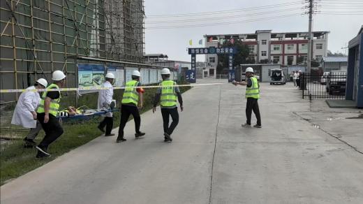 5月23日10時(shí)30分,演練模擬2#廠(chǎng)房外腳手架施工發(fā)生險情。安全員駱世航巡查時(shí)發(fā)現一名工友在距地面2米的外架上突發(fā)失穩墜落,項目安全員立即向應急領(lǐng)導小組匯報??傊笓]接到匯報后立即啟動(dòng)應急預案,各應急救援小組聞令而動(dòng)。警戒疏導組負責一分鐘內完成20平方米警戒區布設;醫療救護組負責攜醫療器材兩分鐘內抵達,實(shí)施初步救治;搶險救援負責規范使用折疊擔架轉運傷員;后勤保障組負責開(kāi)辟應急救援綠色通道,調度項目專(zhuān)屬救護車(chē)待命。各小組分工明確、配合默契,高效完成了應急救援任務(wù)。